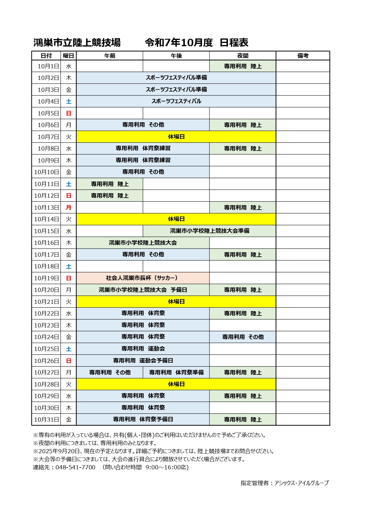 令和7年10月度の陸上競技場日程