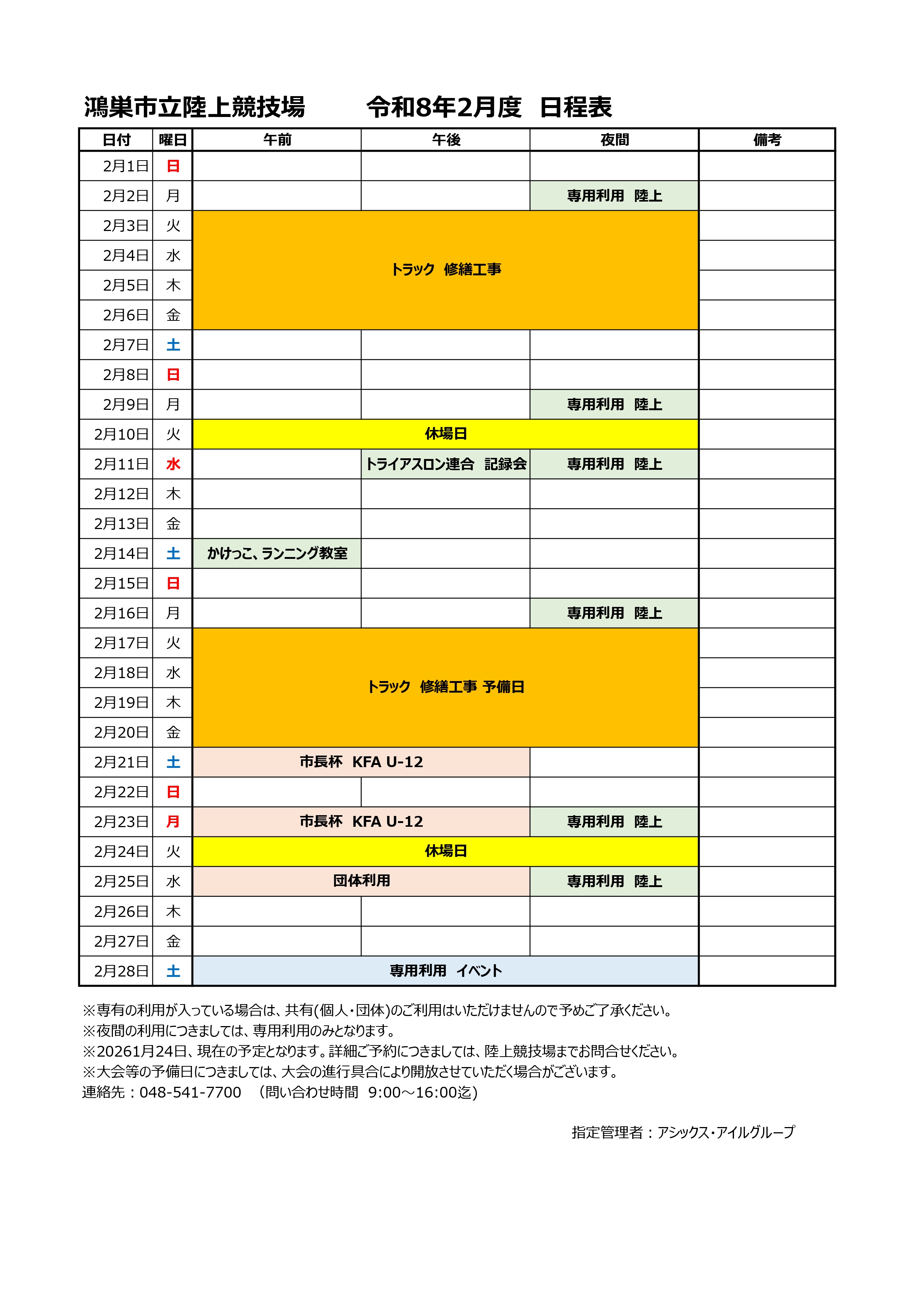 令和8年2月の陸上競技場の日程は下記となります。