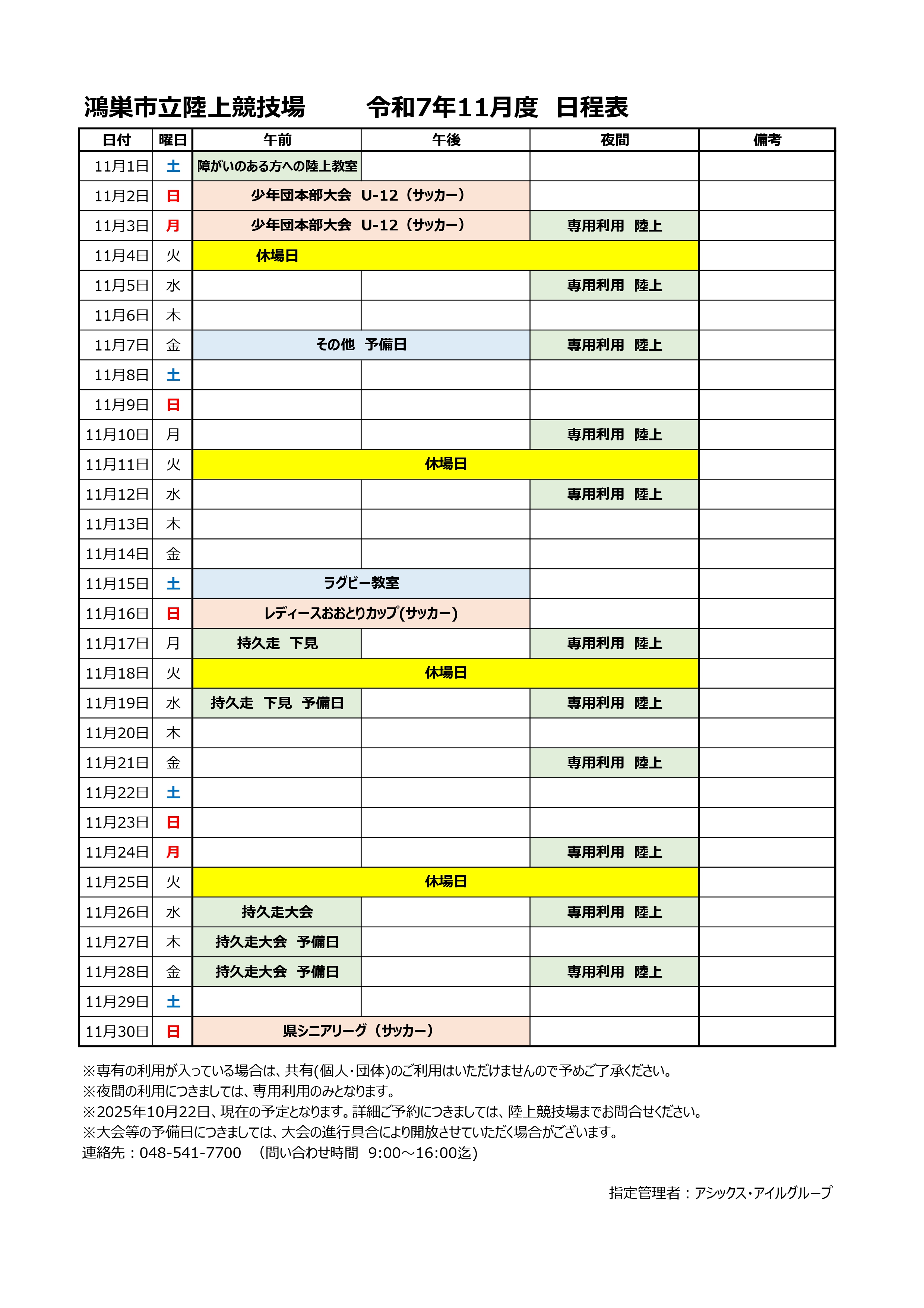 令和7年11月度の陸上競技場の日程表につきまして下記となります。